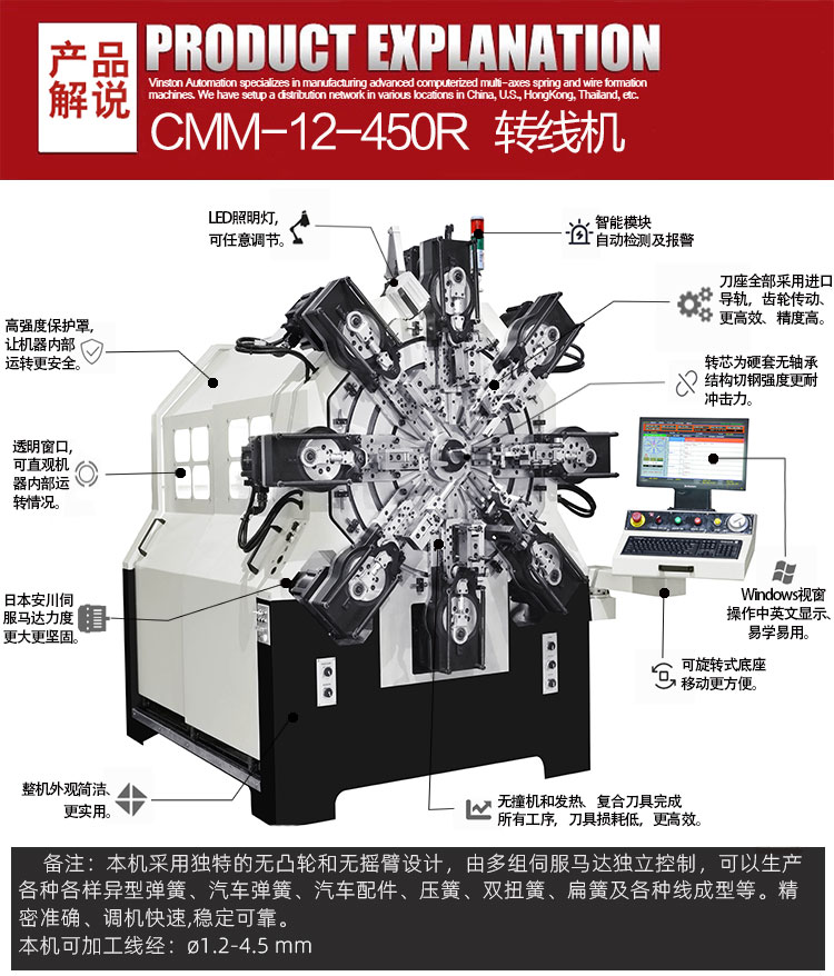 - 產(chǎn)品概述: CMM-12-450R 轉線彈簧機可生產(chǎn)?1.2-4.5 mm線徑彈簧及線成形等),本機采用獨特的無凸輪和無搖臂設計,由多組伺服馬達獨立控制,可以生產(chǎn)各種各樣異型彈簧、汽車彈簧、汽車配件、壓簧、雙扭簧、扁簧及各種線成型等。精密準確、調機快速、穩(wěn)定可靠。