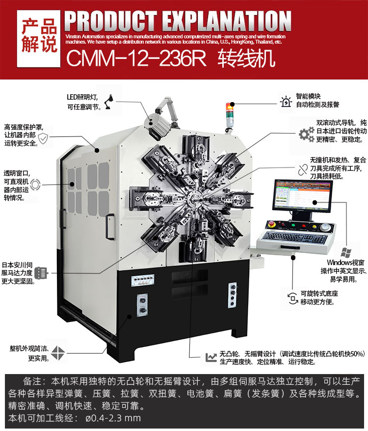 本機型適用于生產(chǎn)電子、電器、文具、儀器、玩具、發(fā)飾、工藝品、線成型等高難度精密彈簧,尤其針對各種內(nèi)(外)雙扭簧特別適合。