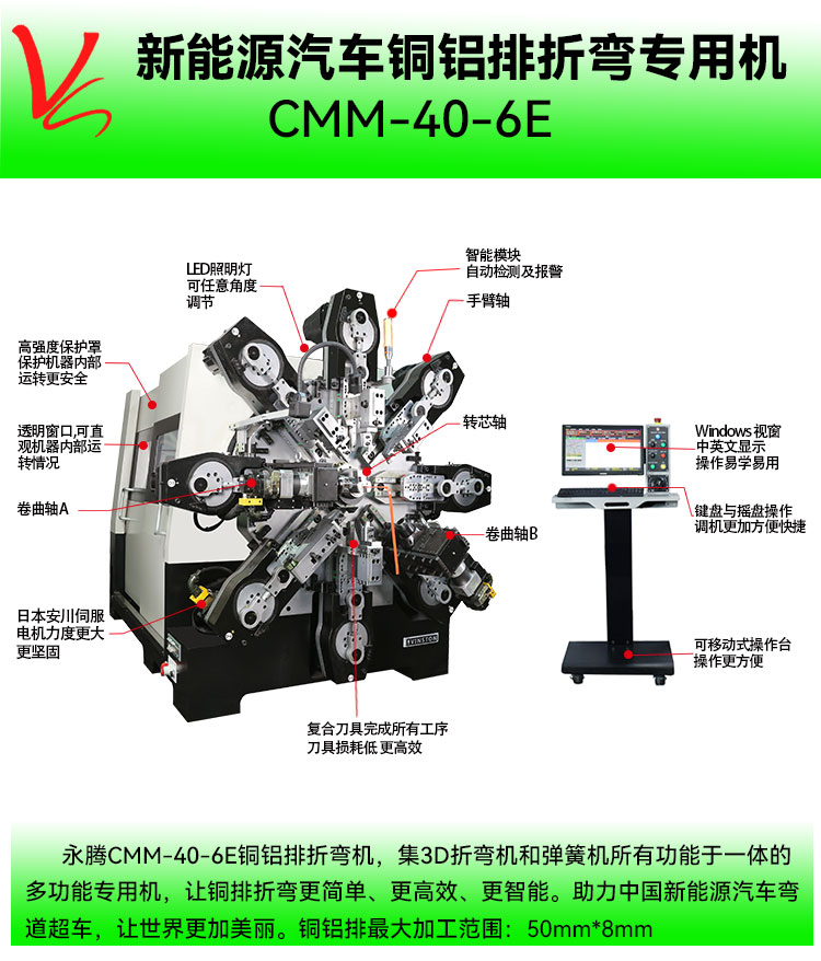 • 產(chǎn)品概述: CMM-40-6E銅排折彎機(銅鋁排最大加工范圍:50mm*8.0mm)集3D折彎機和彈簧機所有的功能于一體的多功能專用機,本機采用獨特的無凸輪和無搖臂設(shè)計,由多組伺服馬達(dá)獨立控制,永騰銅排折彎機廣泛應(yīng)用于導(dǎo)電排成型,新能源電池連接排、新能源電池模組、銅母排成型、硬排成型、導(dǎo)電排、電池連接排、銅排、裸排成型等。精密準(zhǔn)確、調(diào)機快速、穩(wěn)定可靠。