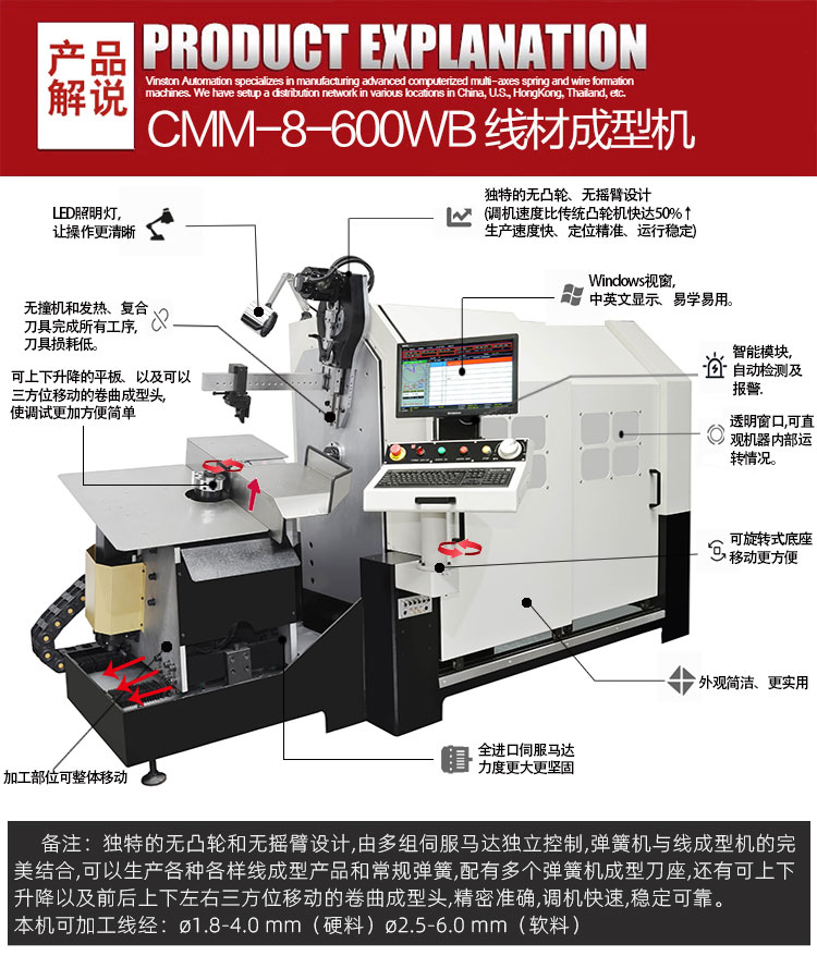 特別說(shuō)明:本機(jī)重點(diǎn)為衛(wèi)廚五金行業(yè)量身打造。除此外,還適用于汽車(chē)、摩托車(chē)、自行車(chē)等及娛樂(lè)健身器材所需的高精密彈簧及線(xiàn)成型的生產(chǎn)。
