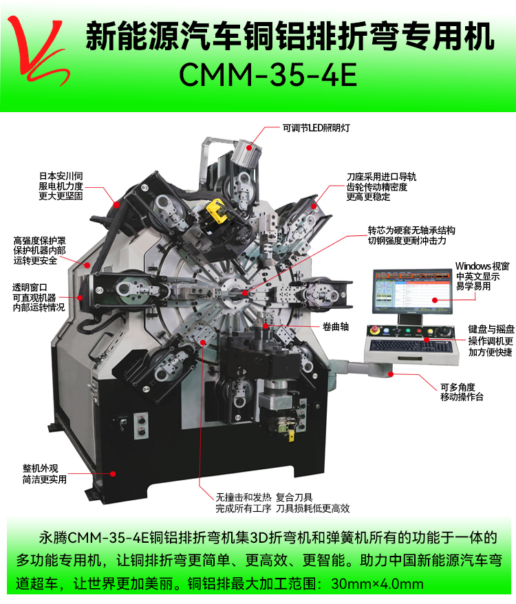 • 產(chǎn)品概述: CMM-35-4E銅排折彎機(jī)(銅鋁排最大加工范圍:30mm*4mm)集3D折彎機(jī)和彈簧機(jī)所有的功能于一體的多功能專用機(jī),本機(jī)采用獨(dú)特的無凸輪和無搖臂設(shè)計(jì),由多組伺服馬達(dá)獨(dú)立控制,永騰銅排折彎機(jī)廣泛應(yīng)用于導(dǎo)電排成型,新能源電池連接排、新能源電池模組、銅母排成型、硬排成型、導(dǎo)電排、電池連接排、銅排、裸排成型等。精密準(zhǔn)確、調(diào)機(jī)快速、穩(wěn)定可靠。